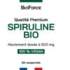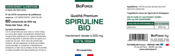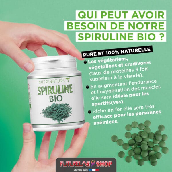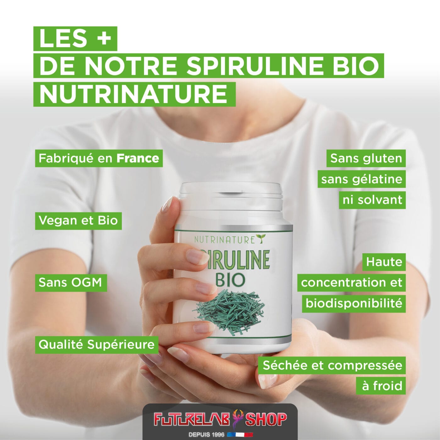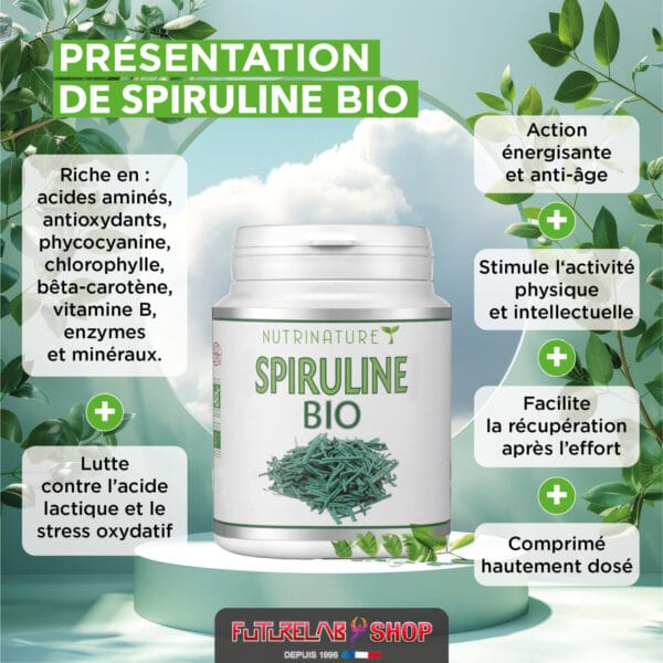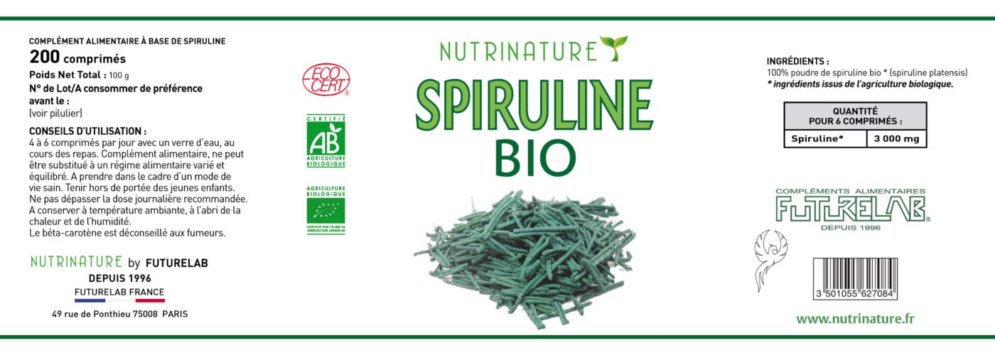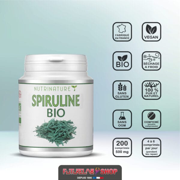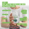 Riche en Acides Aminés, antioxydants phycocyanine, chlorophyle bêta carotène, Vitamine B, enzymes et minéraux.
